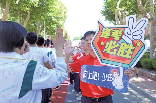 2025年高三毕业典礼上,老师与毕业生击掌鼓劲。