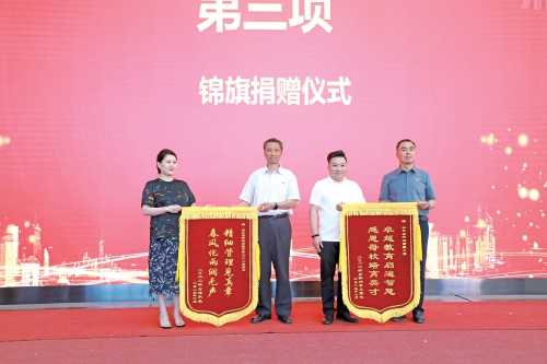 2025年高三毕业典礼上,家长代表向学校领导送上锦旗。